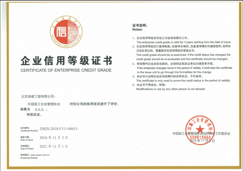 12月7日獲悉,北京崇建公司榮獲中國(guó)施工企業(yè)管理協(xié)會(huì)頒發(fā)的“2020年度工程建設(shè)企業(yè)社會(huì)信用‘AAA’等級(jí)”榮譽(yù)。