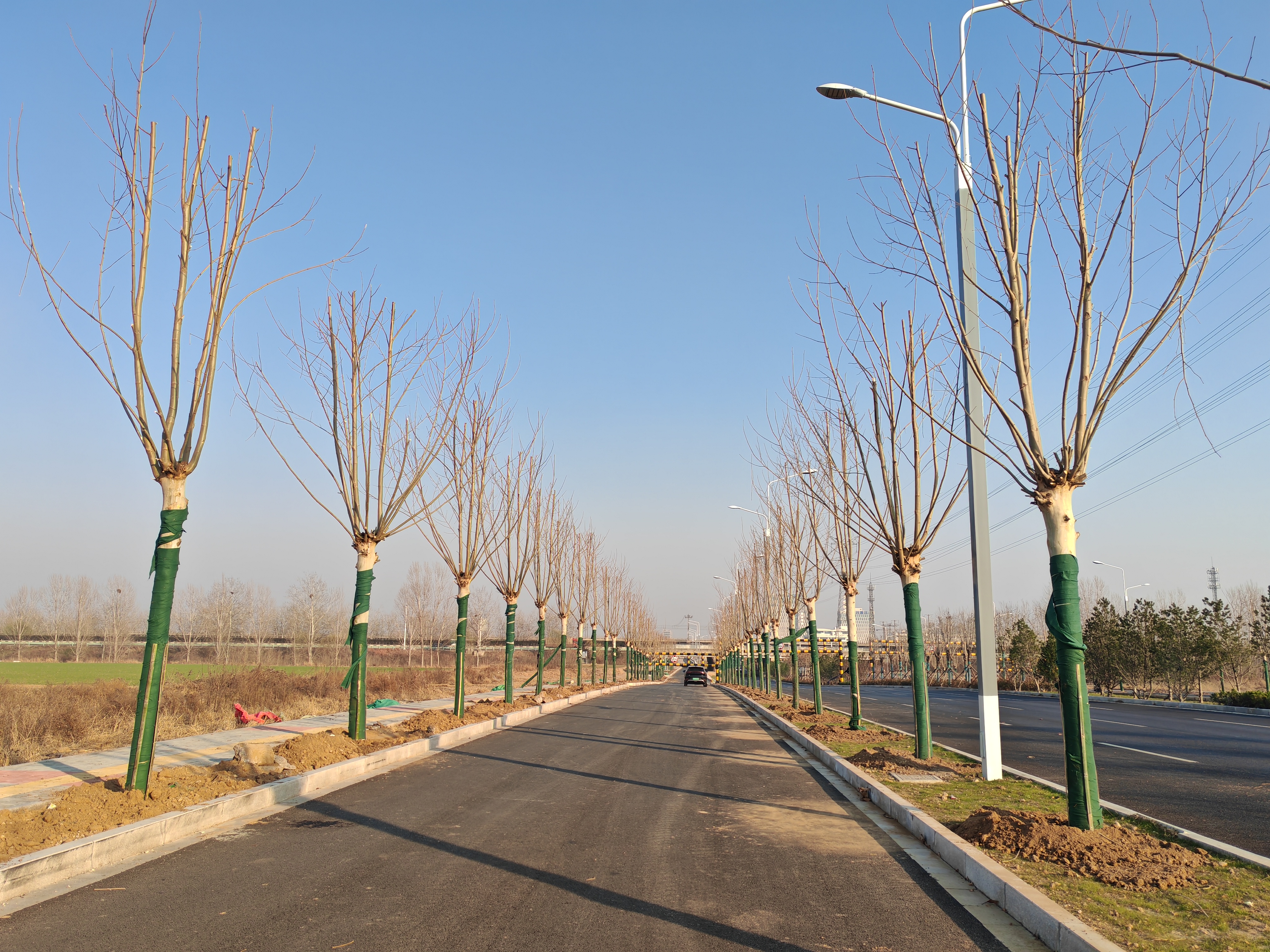 為確保苗木栽種成活率與施工質量,項目提前謀劃、精準施策,從前期準備到現場施工全程嚴把“質量關”。施工過程中,技術質量人員全程駐場指揮,根據苗木規(guī)格調整吊車吊裝角度與力度,確保樹木整體平穩(wěn)吊運、精準入坑;施工人員隨即進行人工微調,校正苗木朝向與垂直度;測量人員同步啟用全站儀實時監(jiān)測,反復核對每株苗木的順直度,確保道路兩側苗木排列整齊、線型流暢;最后由施工班組分層回填種植土并壓實,完成整套栽種流程。在各環(huán)節(jié)無縫銜接、全體人員目標一致的協(xié)作下,順利完成全部綠化苗木栽種任務。